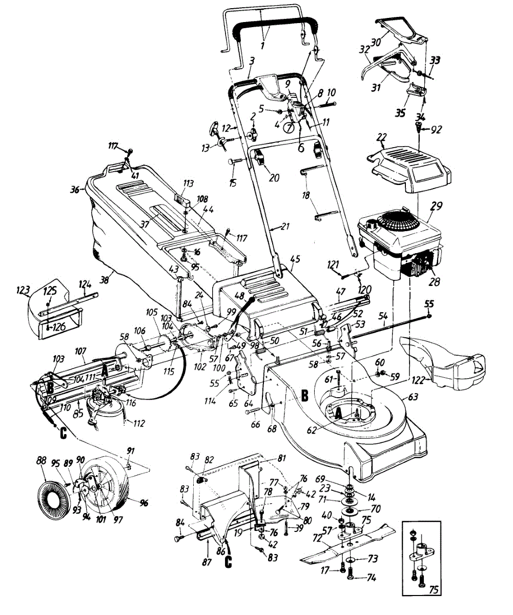 Parts for Mastercut 124-478F336 / 1994: Engine, Grass Catcher, Mulching Kit And Chute Deflector Parts
