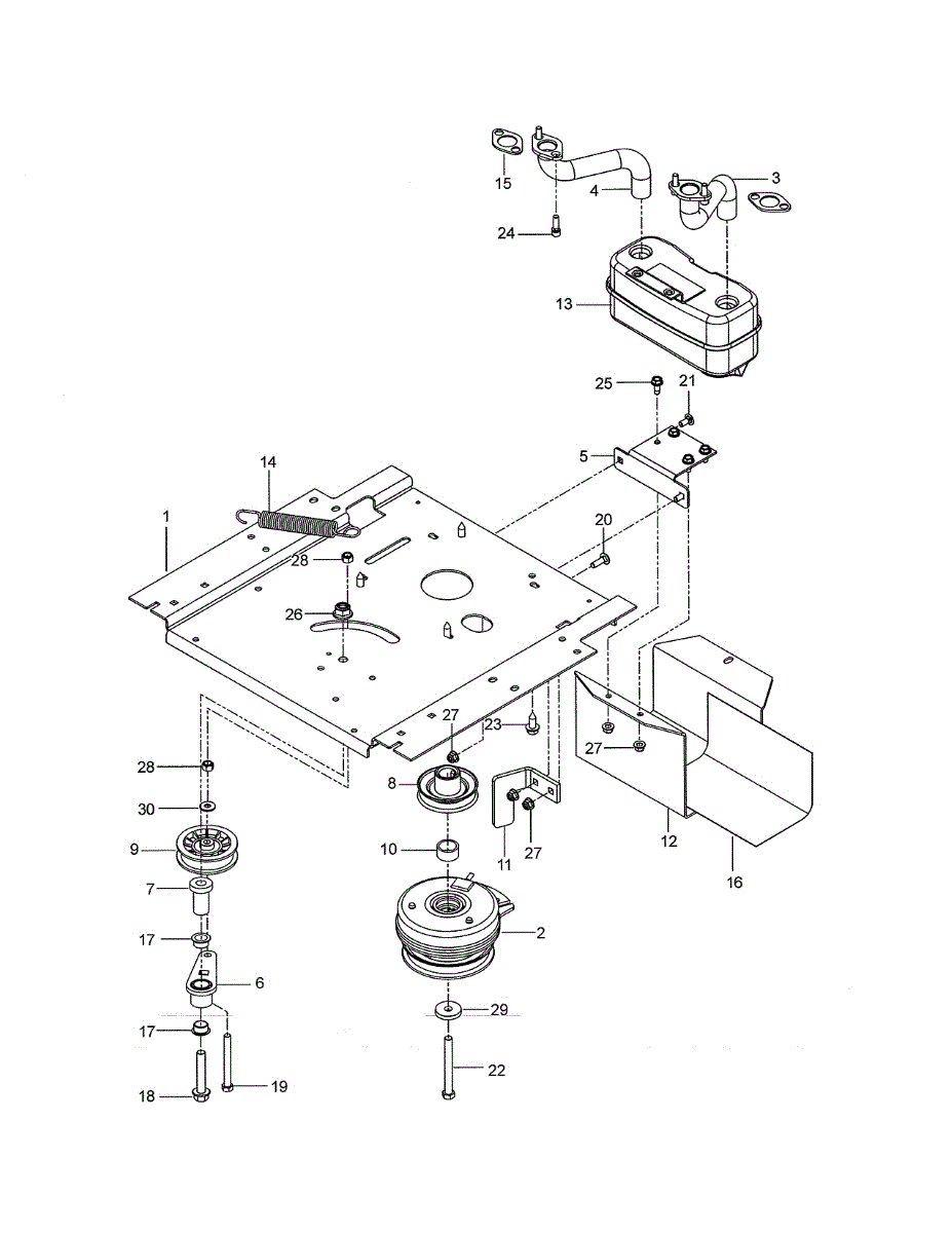 Twin-muffler assembly for riding mowers with two-cylinder engines. Connects to exhaust pipes to reduce noise and emissions. Replace if cracked or damaged.
