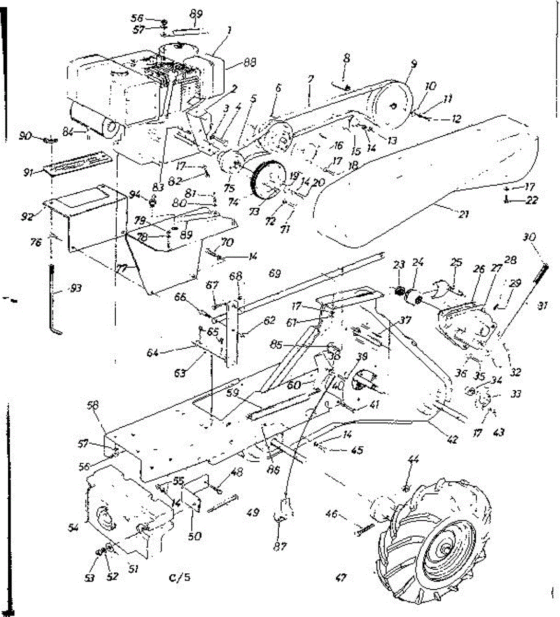 Tire and rim assembly for rear-tine tillers. Replaces cracked, worn, or damaged tires. Mounts to axle for improved traction and maneuverability.