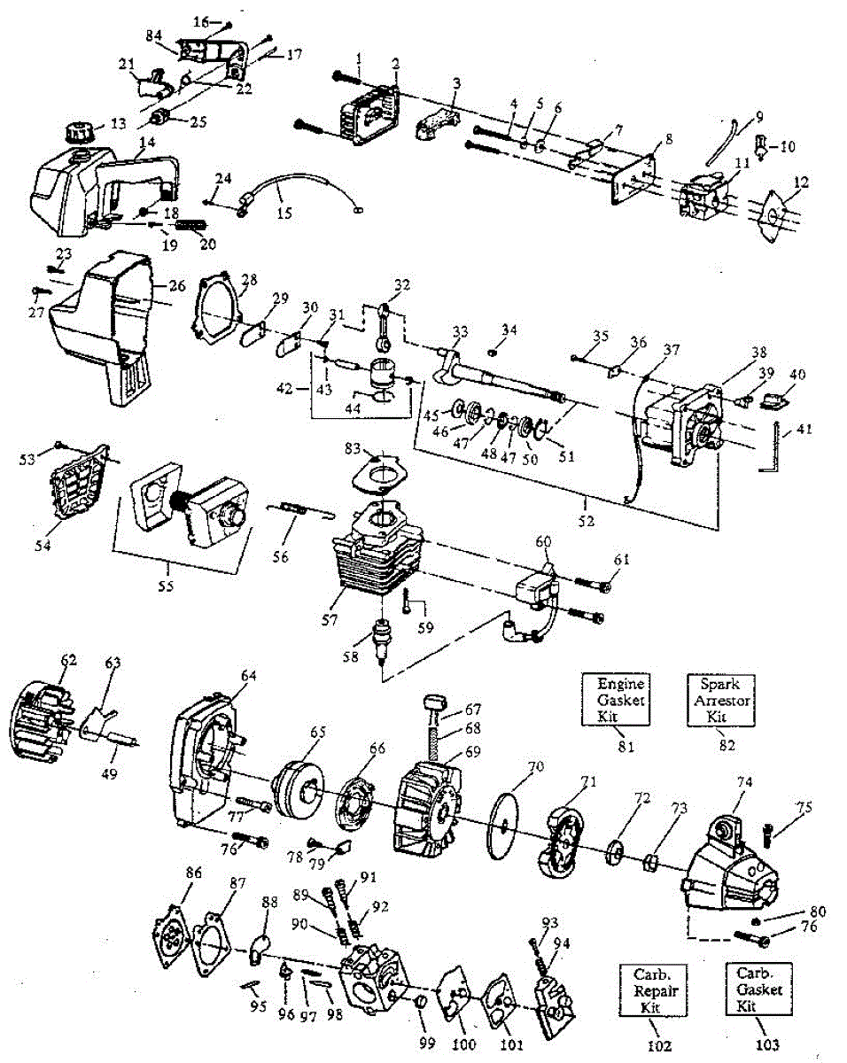 Carburetor assembly kit mixes air and fuel for your chainsaw, trimmer, or blower engine. Replace when engine runs rough, stalls, or won't start. Verify fit with your model number.