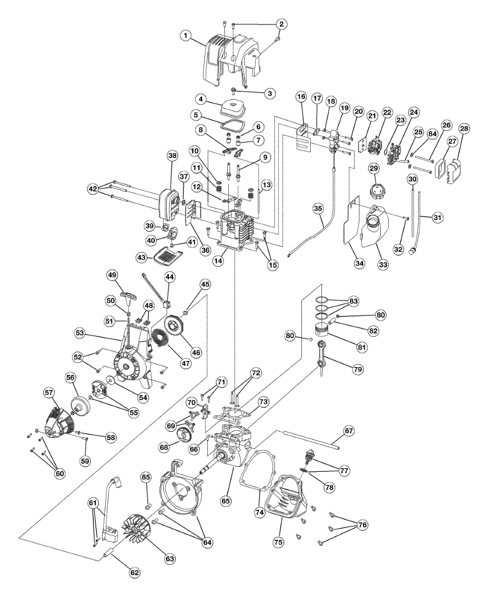 Breather housing assembly for line trimmers and tillers. Replaces cracked, broken, or damaged housings. Installs on engine to maintain proper ventilation.