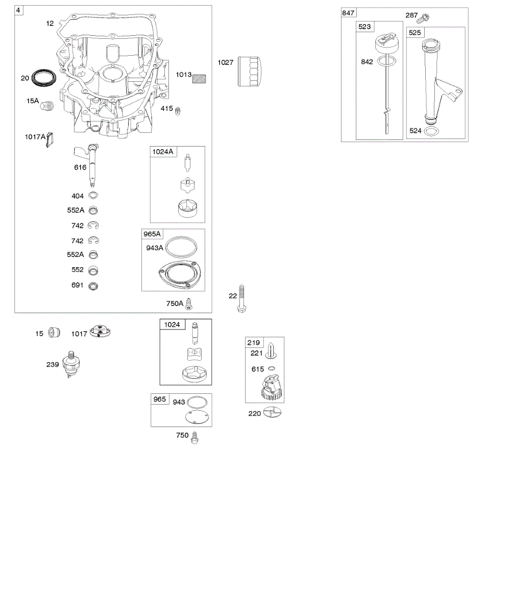 Parts for Briggs & Stratton 401577-0724-E1: Engine Sump, Oil Pump, Dipstick / Tube Assembly Parts