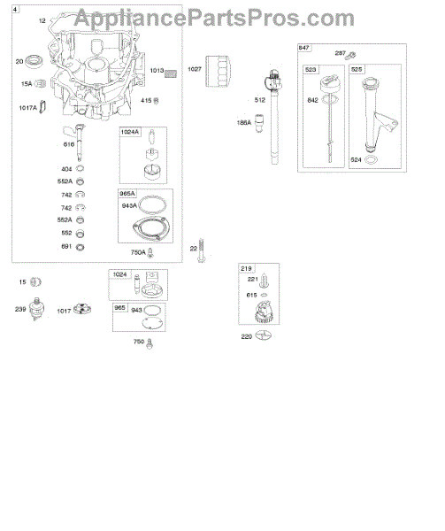 Parts for Briggs & Stratton 445577-0122-E1: Engine Sump, Oil Pump, Dipstick / Tube Assembly Parts