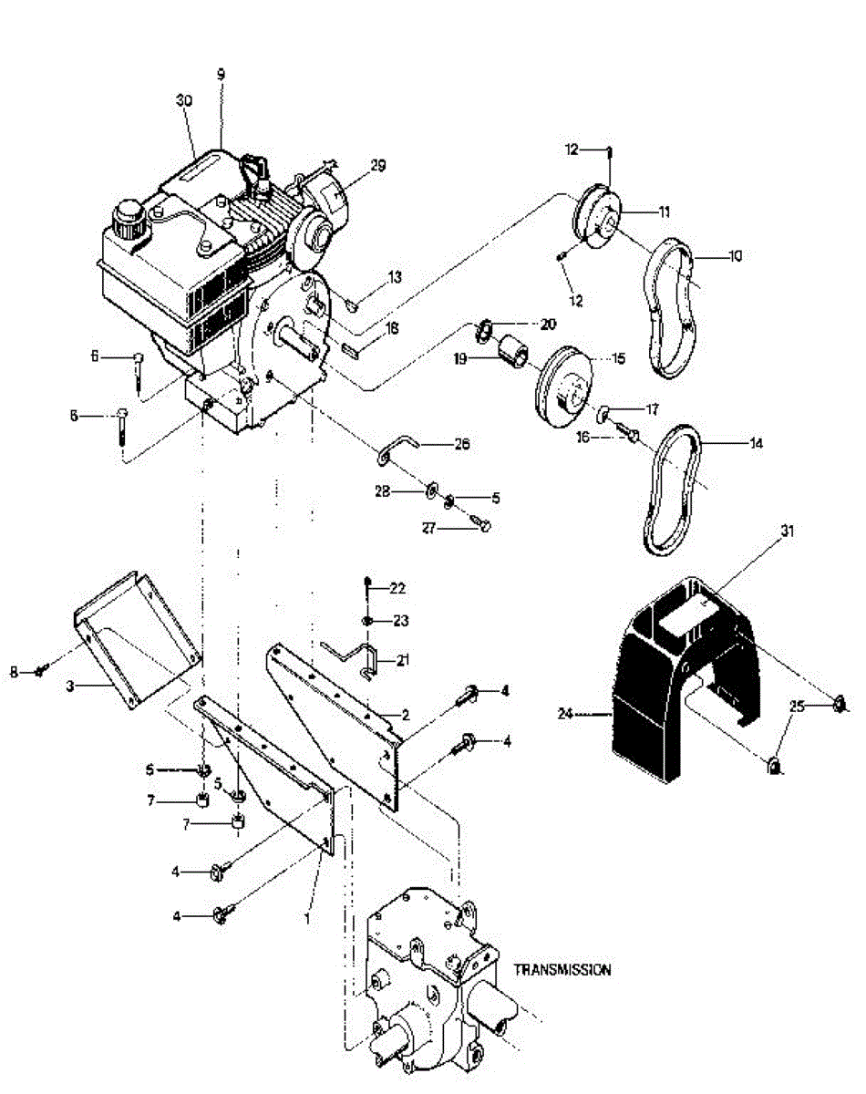 Parts for Troy-Bilt 15006: Engine & Support Brackets, Pulleys, Belts, Belt Cover Parts