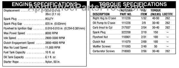 Parts for Mcculloch 41AY65NR077: Engine & Torque Specifications Parts