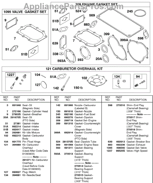 Parts for Briggs & Stratton 326431-0348-99: Engine / Valve / Carburetor Gasket Sets Parts