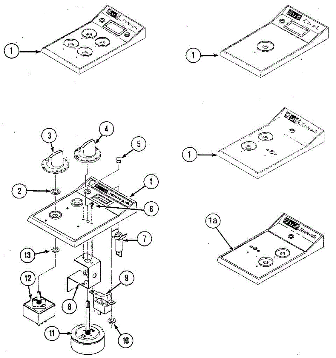Black control knob kit for cooktop burners. Includes four knobs that fit figure-eight shaped shafts. Replace cracked, worn, or missing knobs to restore control.