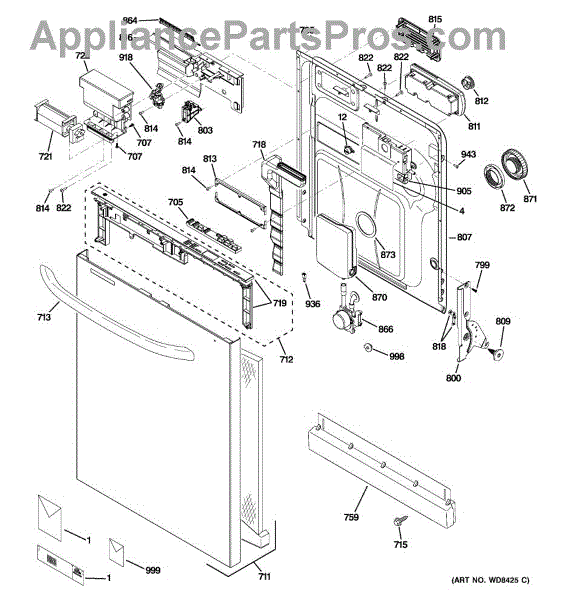 The Detergent and Rinse Aid Dispenser is an OEM part for GE dishwashers. It is responsible for holding and releasing detergent and rinse aid during the dishwashing cycle, ensuring that dishes are cleaned and rinsed effectively.