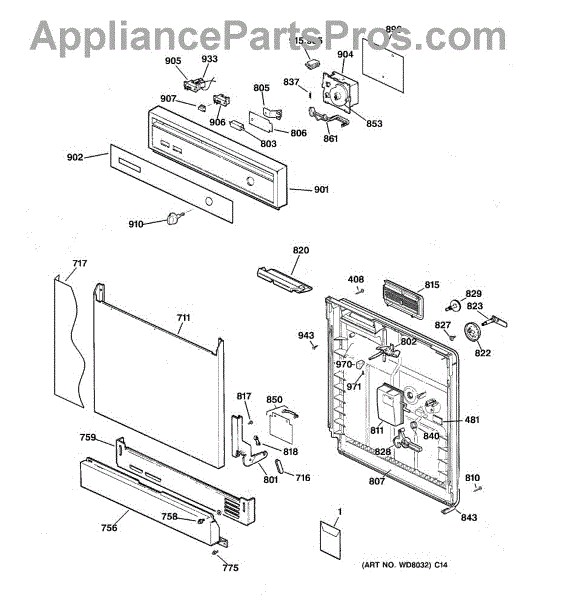 This lever connects to the dishwasher detergent dispenser mechanism and actuates the cup lid. A worn or damaged lever can prevent the dispenser from opening at the right time, reducing wash performance.