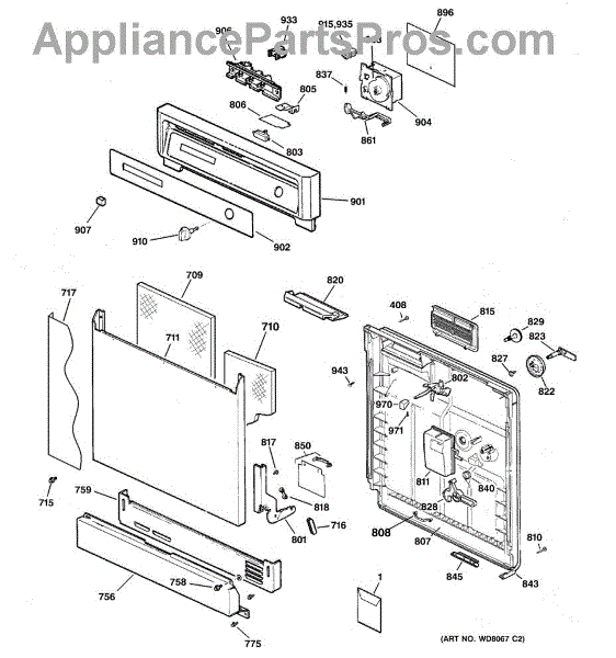 This lever connects to the dishwasher detergent dispenser mechanism and actuates the cup lid. A worn or damaged lever can prevent the dispenser from opening at the right time, reducing wash performance.