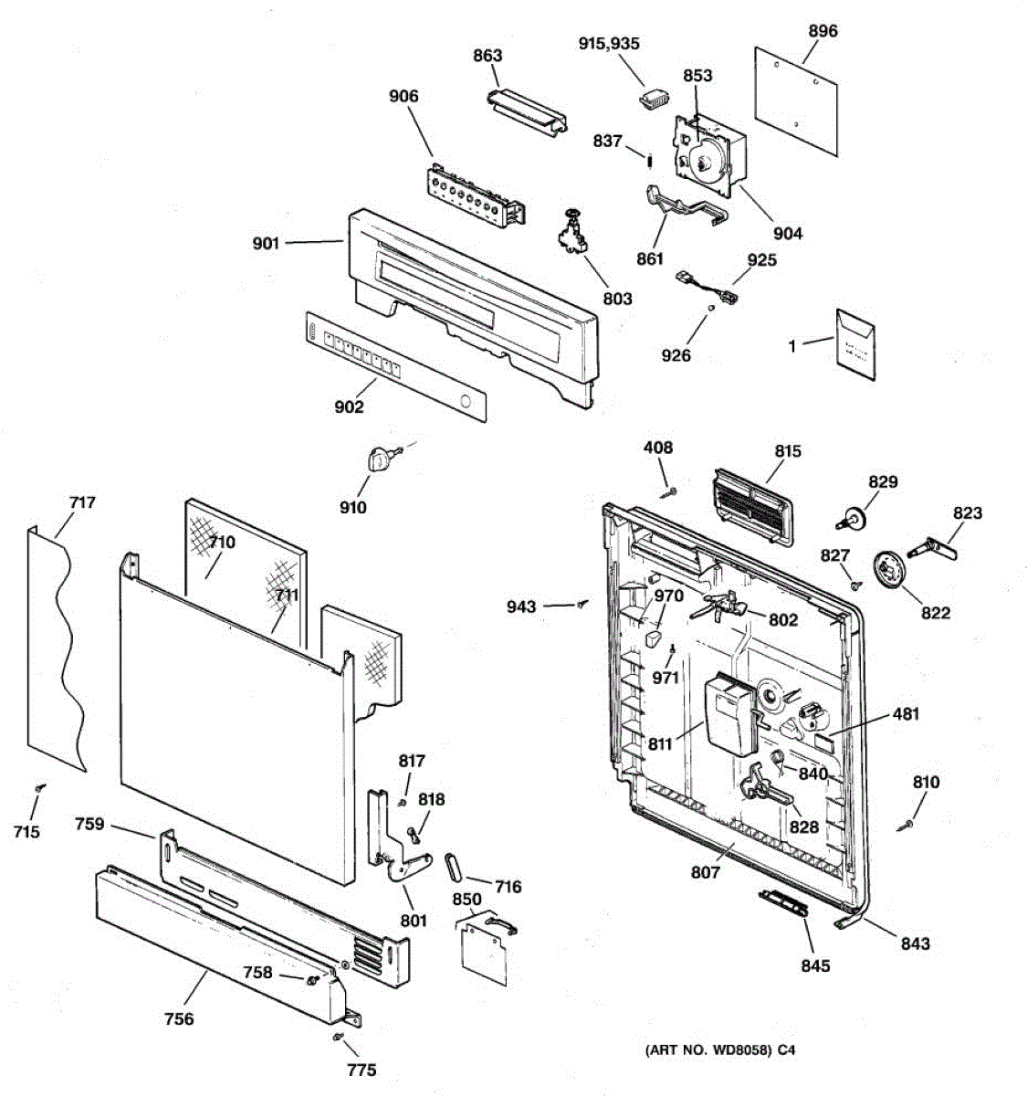 This lever connects to the dishwasher detergent dispenser mechanism and actuates the cup lid. A worn or damaged lever can prevent the dispenser from opening at the right time, reducing wash performance.