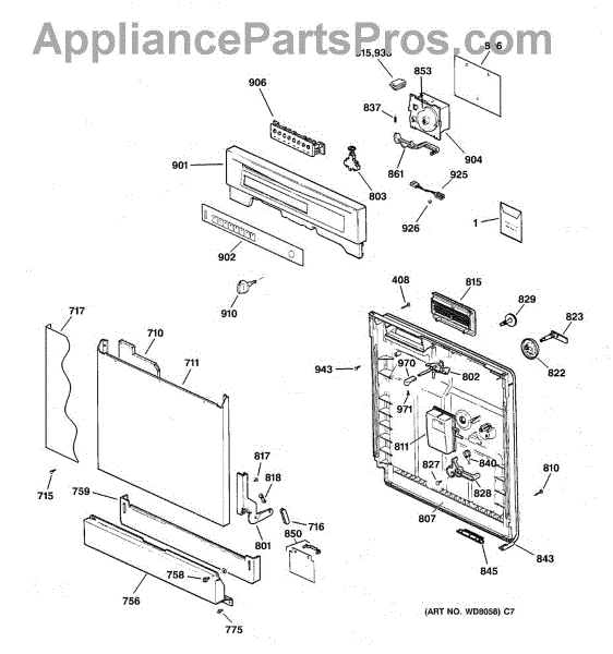 This lever connects to the dishwasher detergent dispenser mechanism and actuates the cup lid. A worn or damaged lever can prevent the dispenser from opening at the right time, reducing wash performance.