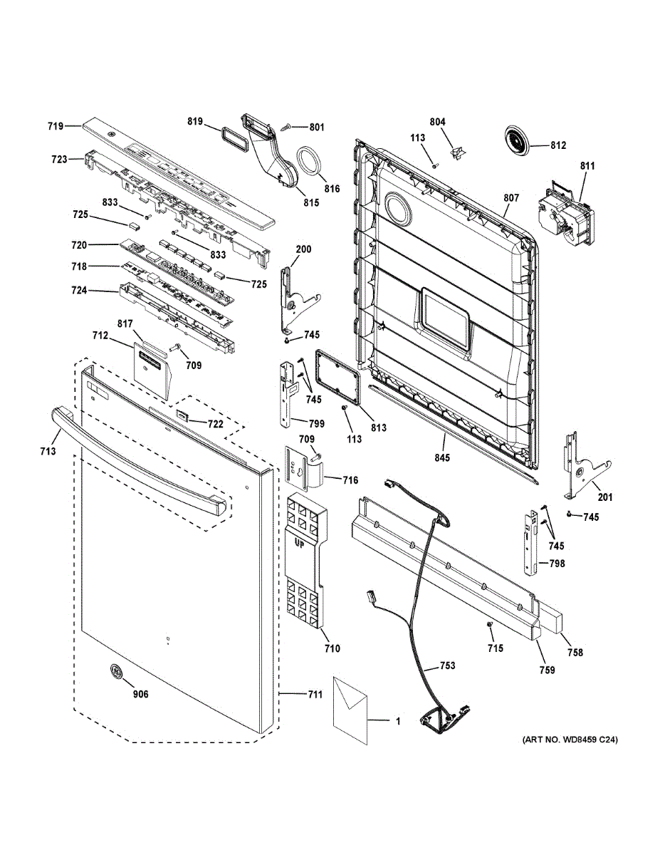 The Door Harness Assembly is an OEM replacement part for GE dishwashers. It is an integral wiring component that connects modules on the dishwasher door to the main control board. These include interactive elements like the latch, temperature probe, and door switch. Causes of failure can include cracked insulation, loose or severed connections, and pinched/chafed wires from repeated bending. Symptoms of a bad door harness include: