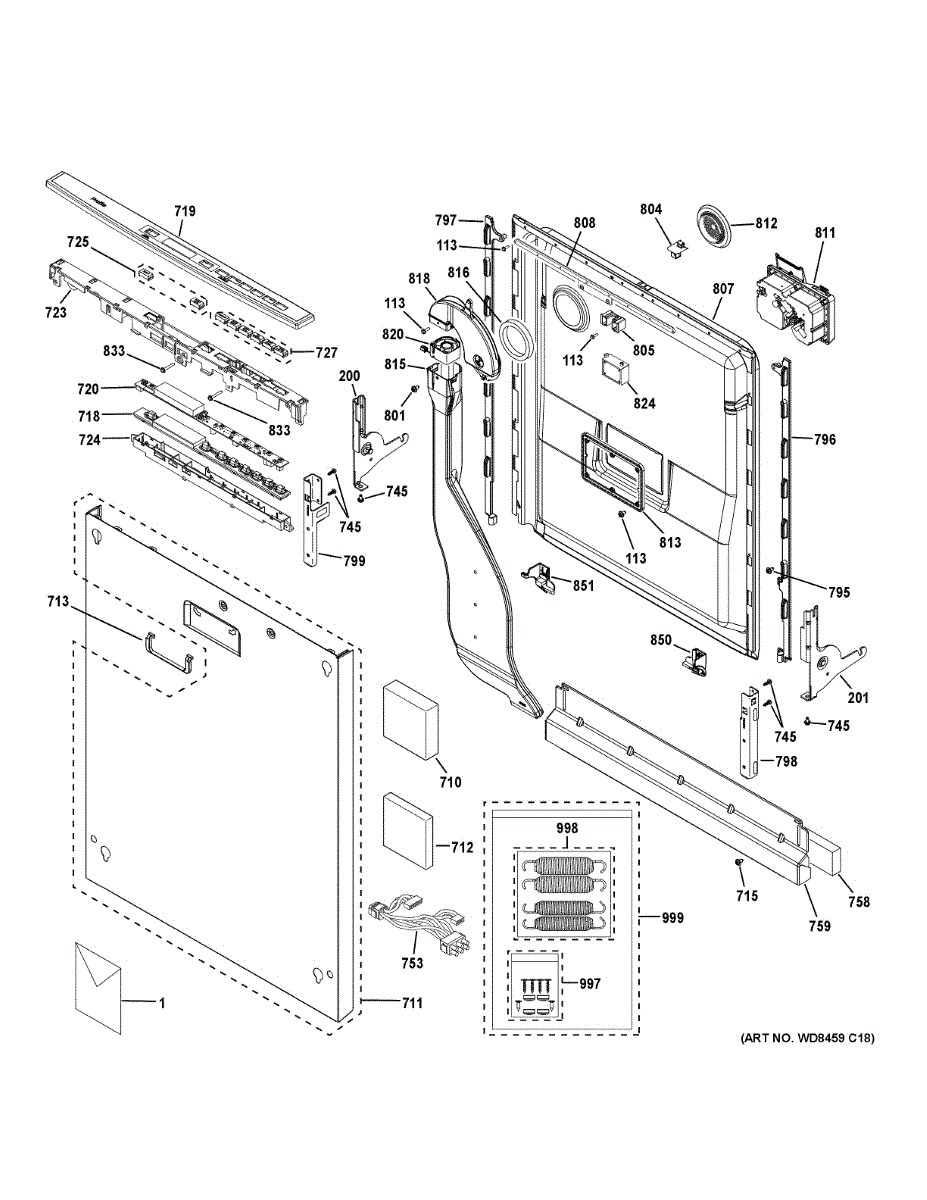 This dishwasher door wire harness assembly carries power and signals between the user interface/control and components in the door. Replacing a damaged harness restores reliable connections and can fix intermittent controls, no-starts, or cycles that stop when the door moves.