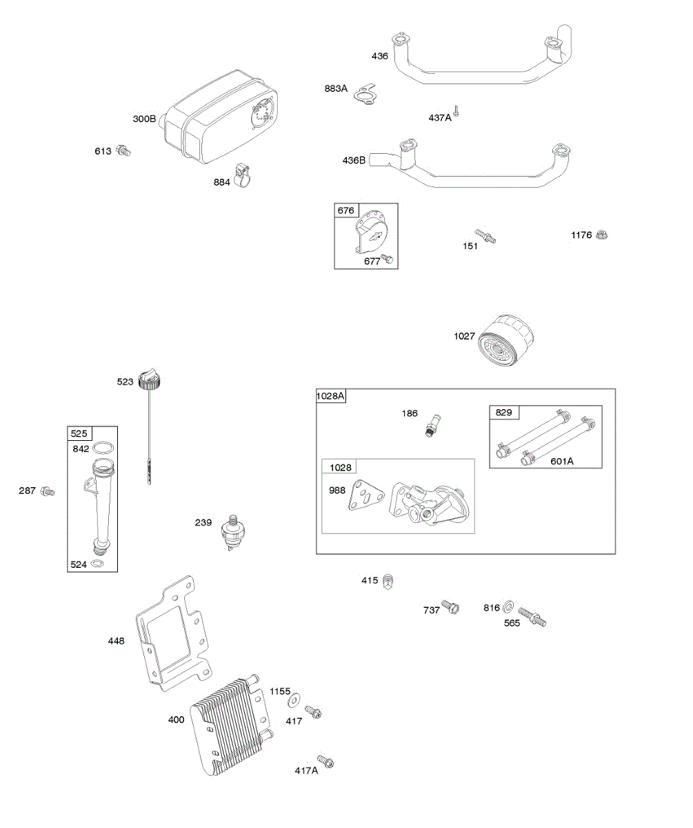 Parts for Briggs & Stratton 386777-0025-G1: Exhaust System, Oil Lubrication, Filter, And Cooler Parts
