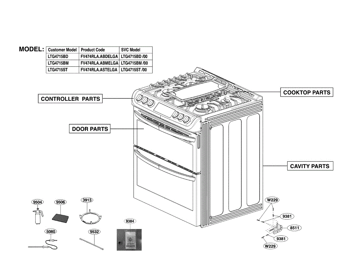 Factory service parts assembly for electric and gas ranges. Replaces worn, damaged, or missing multi-component grouping. Restores original configuration.