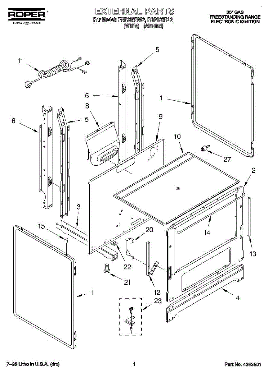 Screw secures appliance panels and access covers. Replace missing, stripped, or corroded screws to restore tight fit and eliminate rattles or gaps.