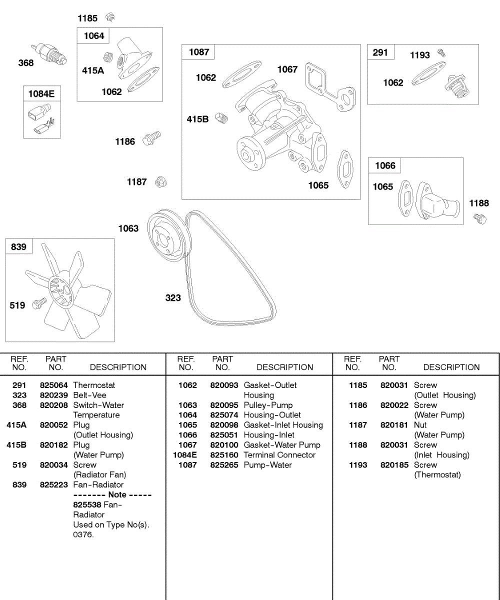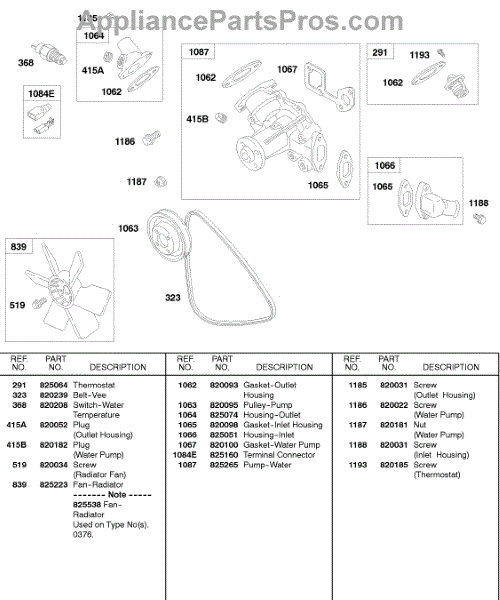 Parts for Briggs & Stratton 432447-0105-A1: Fan, Water Pump, Thermostat, Vee Belt Parts