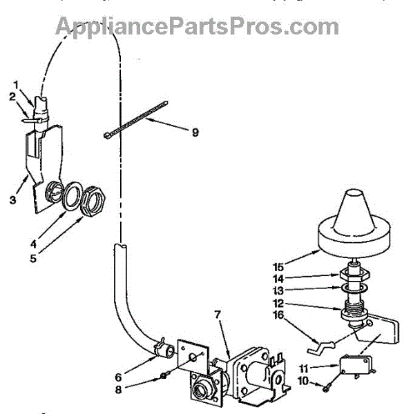 This overfill control switch (float switch) senses water level and helps stop the fill valve to prevent overfilling. It replaces a worn or failed water-level safety switch to restore proper fill control and reduce overflow risk. What it does: