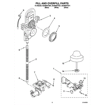 This overfill float and shaft assembly monitors the dishwasher's water level. As the tub fills, the float rises and triggers the float switch to shut off the inlet water, helping prevent overfilling and leaks.