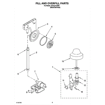 This overfill float and shaft assembly monitors the dishwasher's water level. As the tub fills, the float rises and triggers the float switch to shut off the inlet water, helping prevent overfilling and leaks.