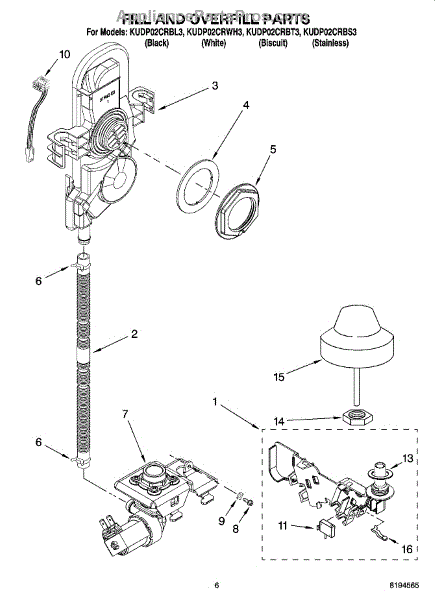 This overfill float and shaft assembly monitors the dishwasher's water level. As the tub fills, the float rises and triggers the float switch to shut off the inlet water, helping prevent overfilling and leaks.
