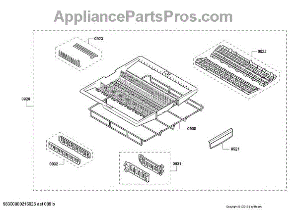The Insert is an OEM replacement part for Bosch dishwasher racks. Situated at the base of upper racks, it supports and secures finer dishes during wash cycles. Proper insert function prevents damage to delicate glass and plates from shifting. Causes of a bad insert can include cracks or fractures from repeated loading/unloading of heavy or unstable dish loads. Detergent and heat exposure causes flexible plastic to warp and sag over many years. Symptoms include: