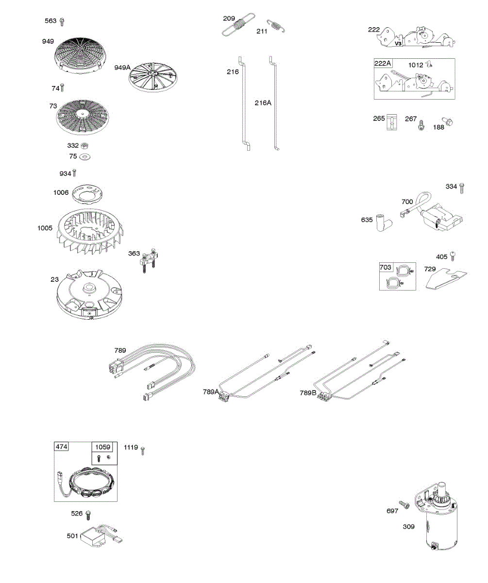 Parts for Briggs & Stratton 44T977-0012-G1: Flywheel, Controls, Wire Harness, Alternator, Starter Parts
