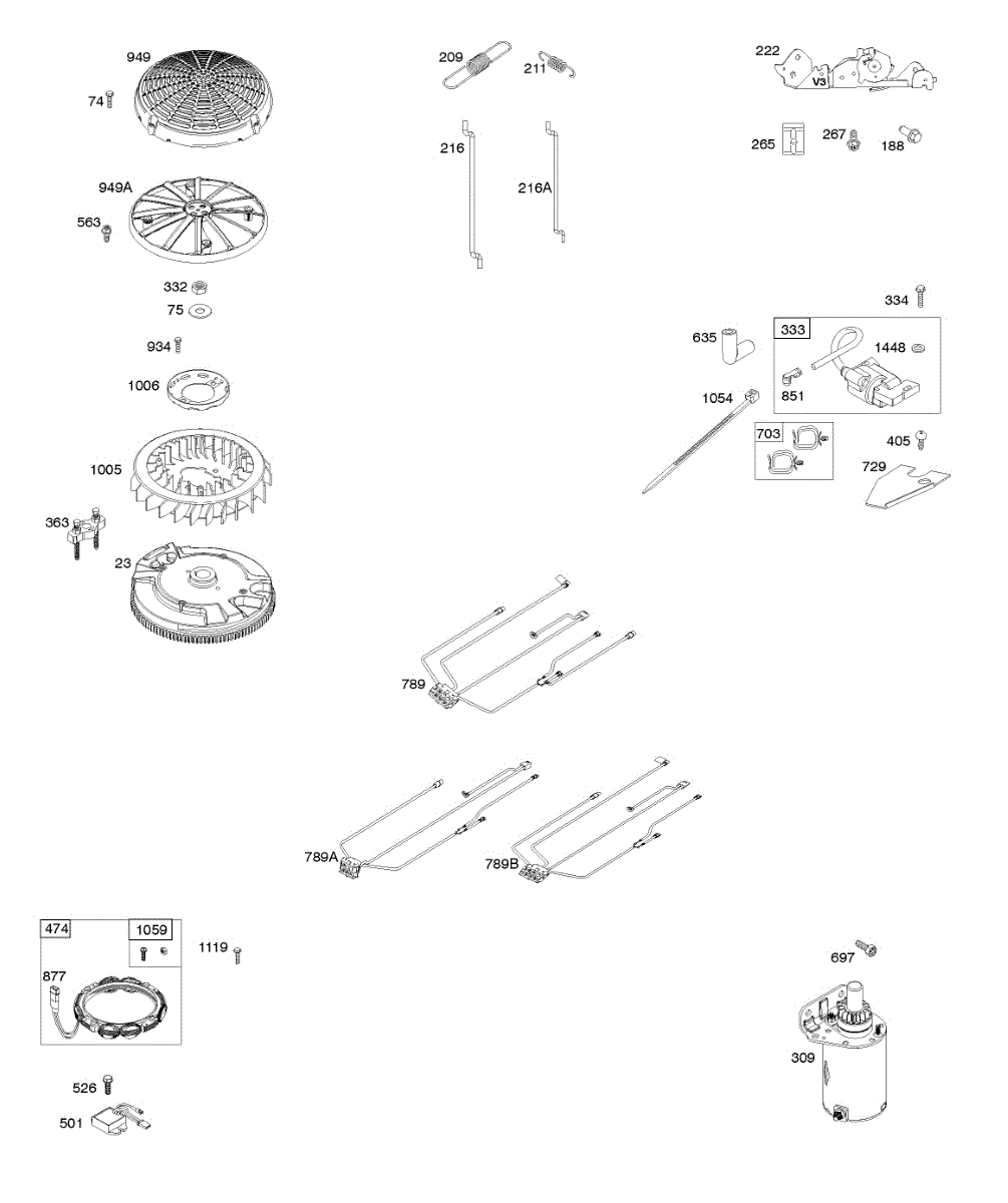 Parts for Briggs & Stratton 49T777-0003-G1: Flywheel, Controls, Wire Harness, Alternator, Starter Parts