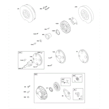 Parts for Briggs & Stratton 385447-0134-B1: Flywheel, Rotating Screens, Rewind Starter, Rewind Starter Parts