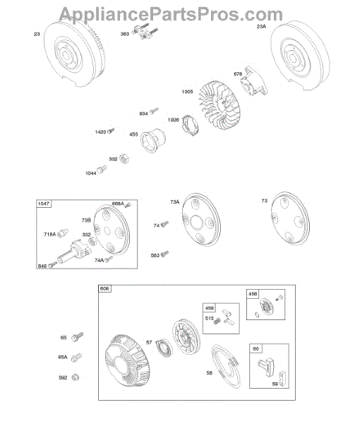 Parts for Briggs & Stratton 385447-0202-B1: Flywheel, Rotating Screens, Rewind Starter, Rewind Starter Parts