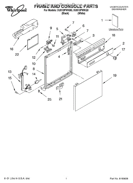 Parts for Whirlpool DU910PWKQ0: 01 - Frame And Console, Literature Parts