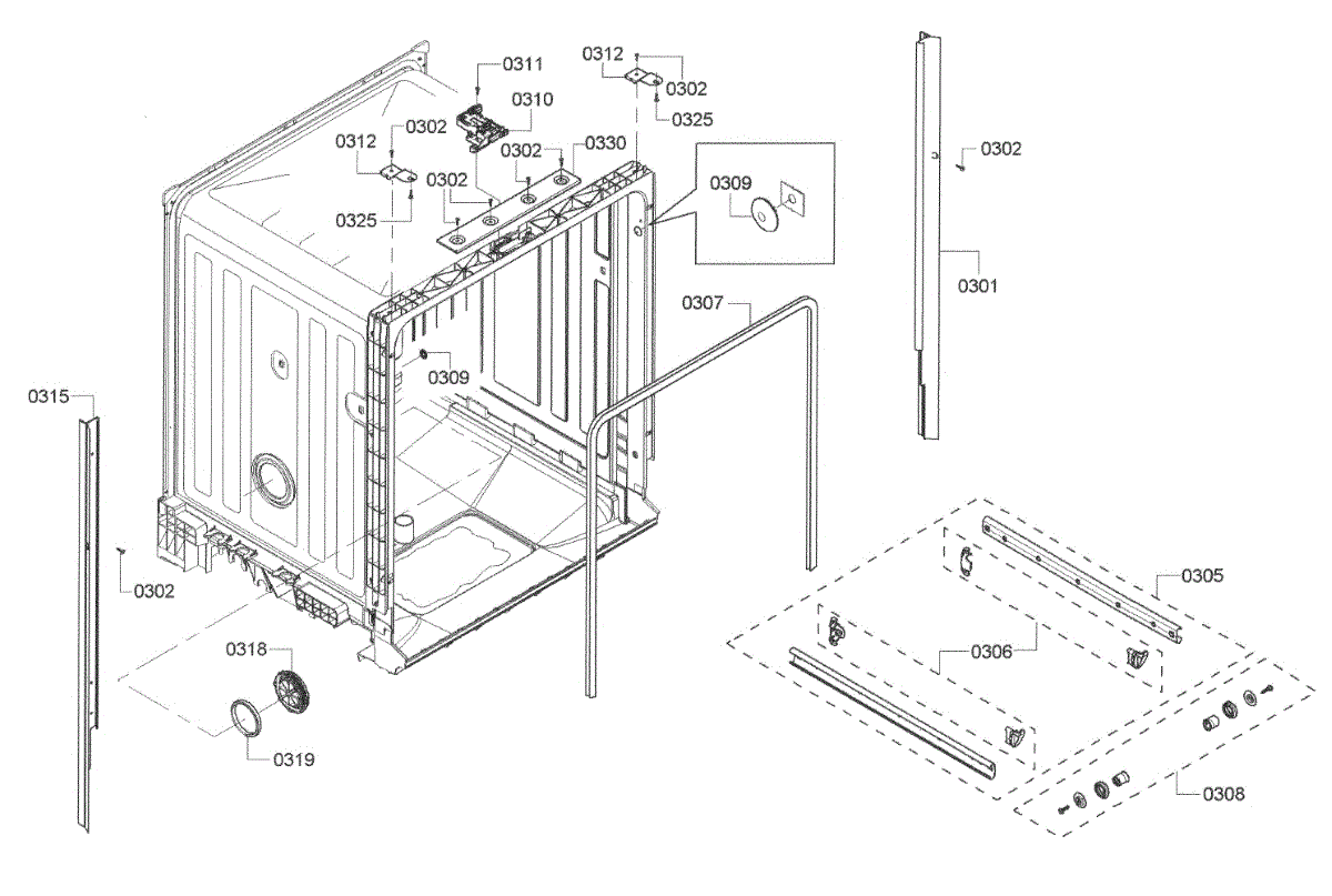 Mounting screw for dishwasher assembly. Secures internal components and panels. Replace if lost, stripped, or corroded during repairs or maintenance.