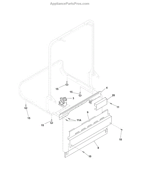 This lower toe plate mounts at the base of the dishwasher's front. It covers the gap beneath the door to protect internal components and restore a clean, finished look when the original kick panel is dented, cracked, or missing.