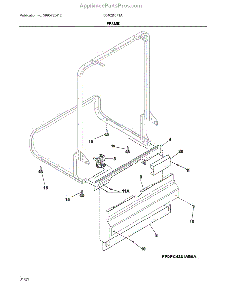This kickplate assembly is the lower front panel at the base of the dishwasher. It restores a clean, finished look while helping shield internal components from kicks, dust, and splashes at floor level.