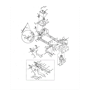 Mounting bracket assembly for lawn tractors. Secures and connects components to the frame. Replace if cracked, bent, or broken to restore stability.