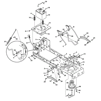 Deck engagement cable for riding mowers with 46" decks. Pulls the belt idler pulley to engage cutting blades. Replace if broken, frayed, or stretched.