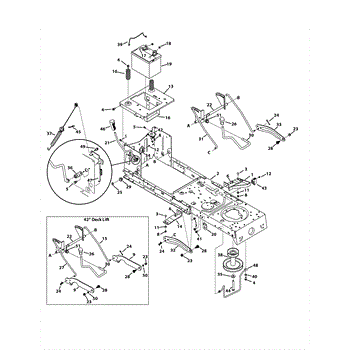 Deck lift shift assembly for lawn tractors. Mounts to the control panel area to adjust mowing height. Replace if lever is cracked, broken, or missing.
