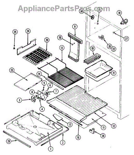 This refrigerator ice bucket stores ice made by the icemaker and positions it for dispensing. Replacing a cracked or warped bin restores smooth ice flow and helps prevent jams, spills, and mess inside the freezer.