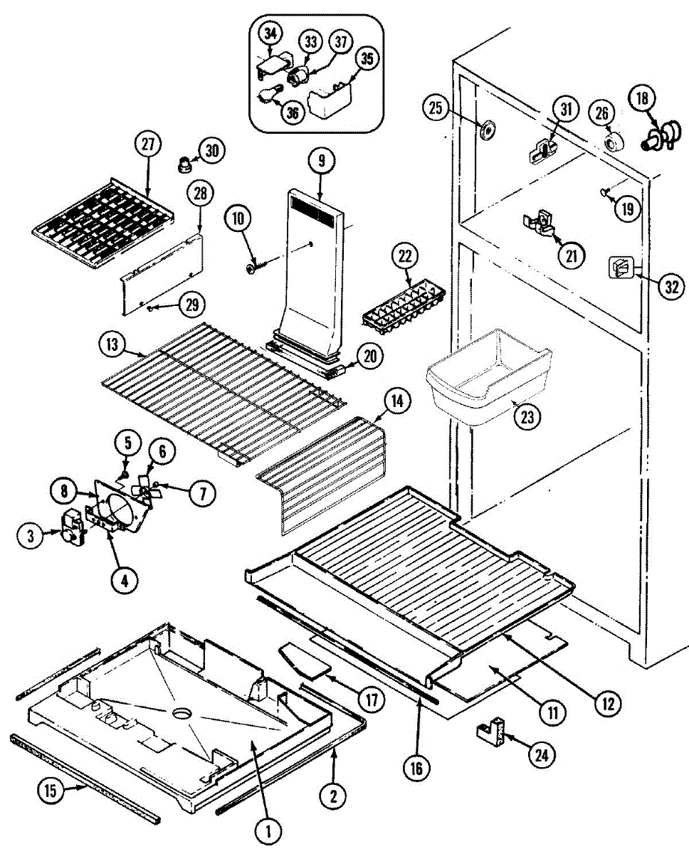 This refrigerator ice bucket stores ice made by the icemaker and positions it for dispensing. Replacing a cracked or warped bin restores smooth ice flow and helps prevent jams, spills, and mess inside the freezer.