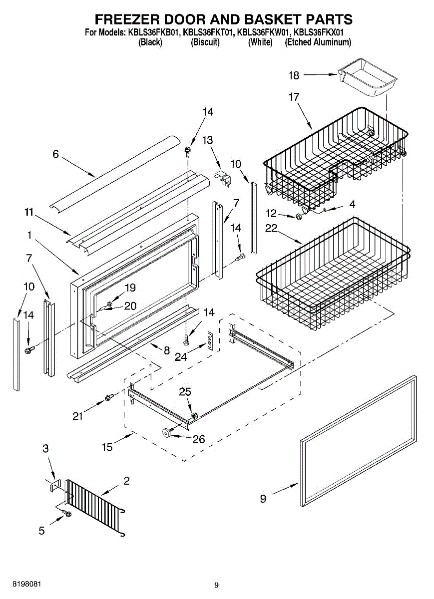 Parts for Kitchenaid KBLS36FKW01: 06 - Freezer Door And Basket Parts