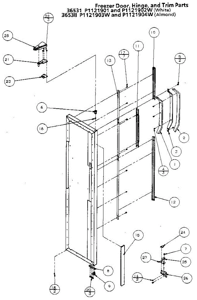 Parts for Amana 36531-P1121902W: Freezer Door, Hinge, And Trim Parts