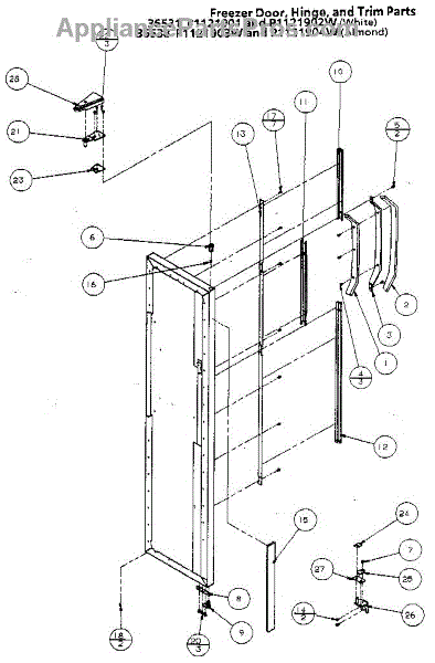 Parts for Amana 36538-P1121903W: Freezer Door, Hinge, And Trim Parts