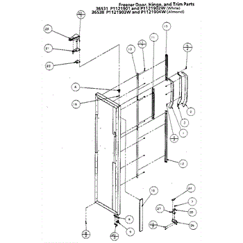 Parts for Amana 36538-P1121904W: Freezer Door, Hinge, And Trim Parts