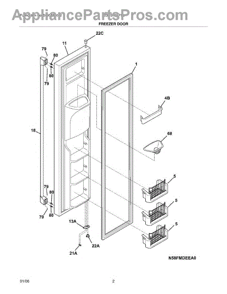 This freezer door gasket forms the airtight seal between the freezer door and cabinet. Replacing a worn or damaged seal helps keep cold air in, reduce frost buildup, and restore proper temperatures and efficiency.