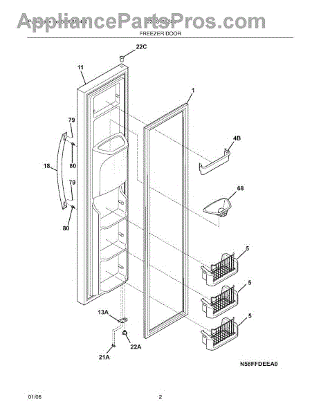 This freezer door gasket forms the airtight seal between the freezer door and cabinet. Replacing a worn or damaged seal helps keep cold air in, reduce frost buildup, and restore proper temperatures and efficiency.