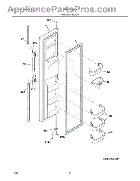 Replacement freezer door shelf for side-by-side refrigerators. Holds items in the freezer door for organized storage. Replace if cracked or broken.