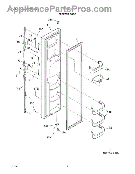 White freezer door bin for side-by-side refrigerators. Replaces broken, cracked, or missing door storage bins. Installs on freezer door.
