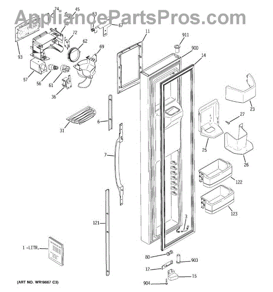 The Ice Door Assembly is an OEM part for GE refrigerators. It is integral to the ice dispenser system, controlling access to the ice chute. This component ensures the efficient delivery of ice cubes or crushed ice when activated and seals off the chute when not in use to maintain the freezer's temperature and prevent frost buildup.