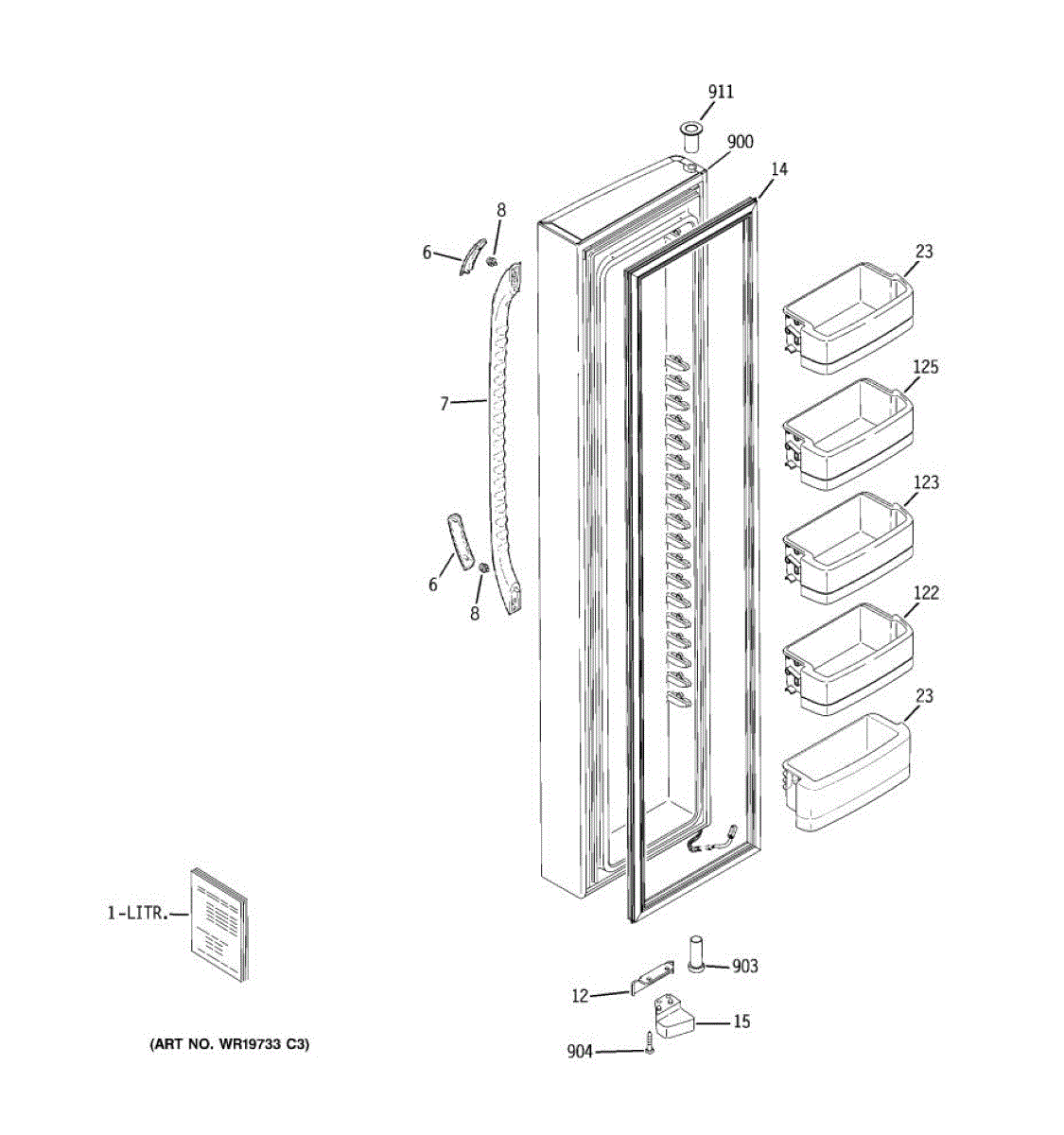 Fixed freezer door shelf module for refrigerators. Replaces cracked, broken, or missing door shelves. Installs on freezer door to hold items securely.